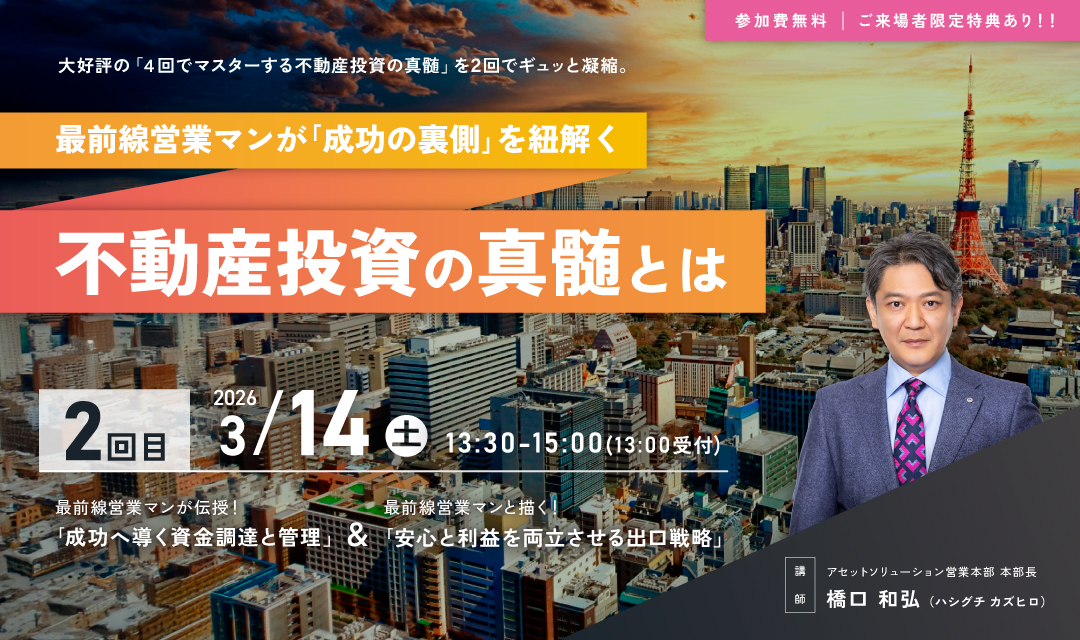「最前線営業マンが『成功の裏側』を紐解く不動産投資の真髄とは」(2回完結セミナー)第2回を開催いたします。