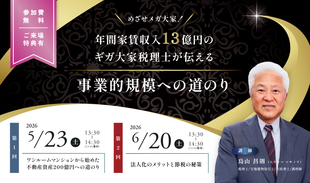 【参加無料│セミナー】年間家賃収入13億円のギガ大家税理士が伝える「事業的規模への道のり」(5/23・6/20開催)