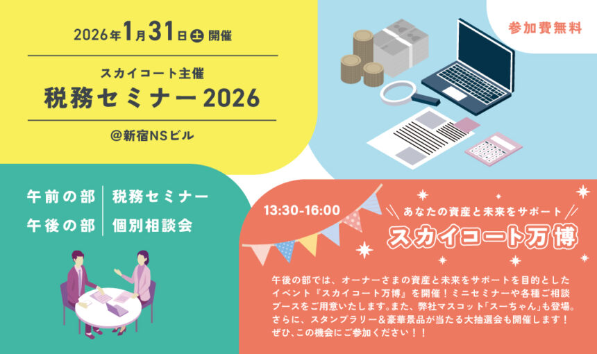 2026年1月31日(土)弊社のオーナー様から大好評の「税務セミナー」を開催いたします。 こちらのお知らせをご覧いただいた方10名様限定で、 […]